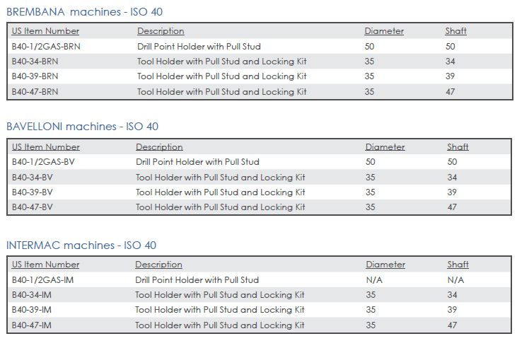 We offer CNC tool holders for different CNC machines, including Brembana, Bavelloni, and Intermac.
